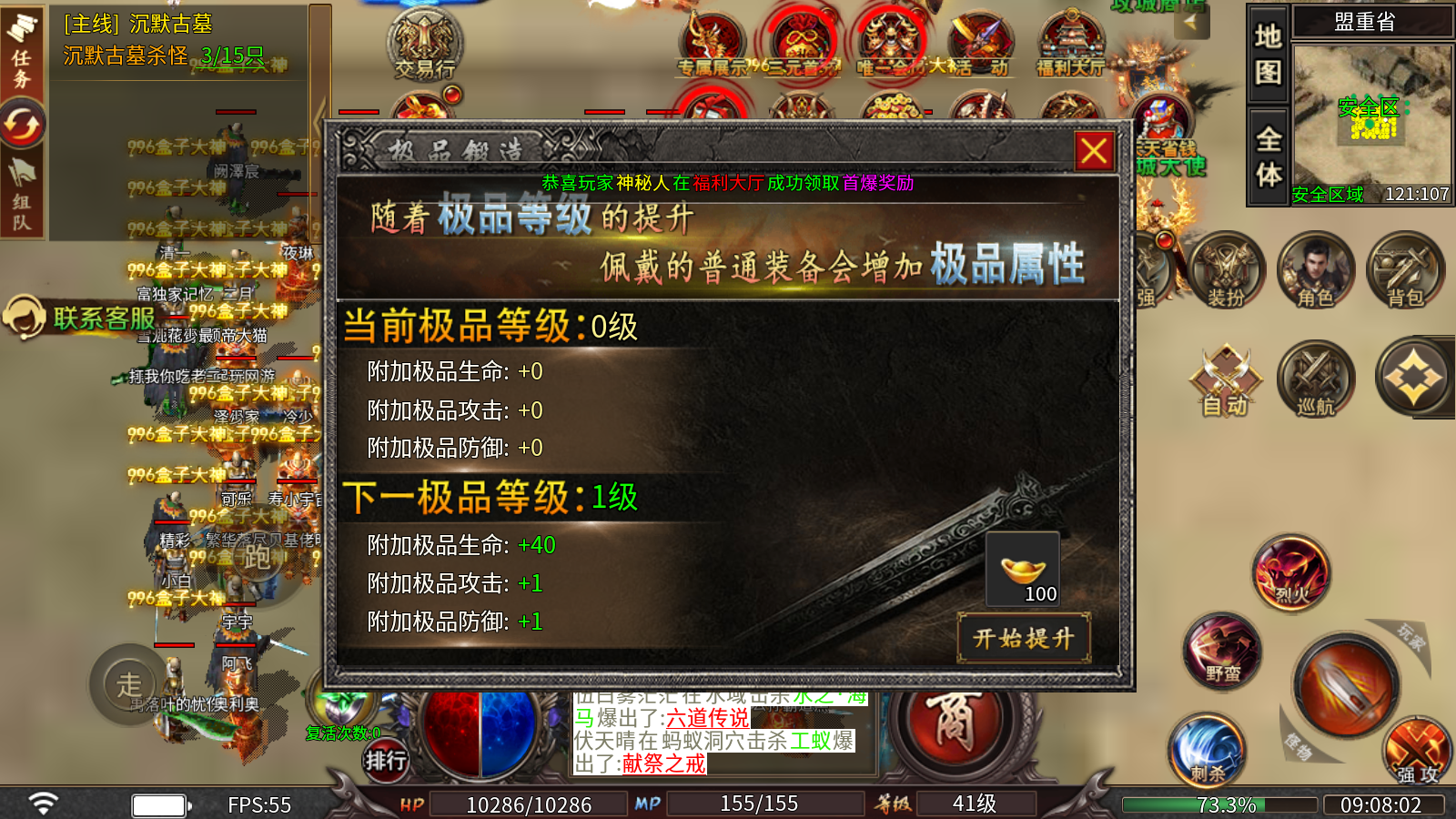 2、极品锻造:消耗元宝即可提升极品等级,随着极品等级的提升,佩戴的普通装备会增加极品属性。