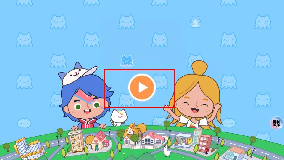 1、点击启动界面中央的橙色播放按钮,即可进入以蓝色为底色、布满猫咪图案的米加小镇世界,画面里两个卡通角色与迷你城镇模型相互映衬,由此正式开启创意互动体验之旅。