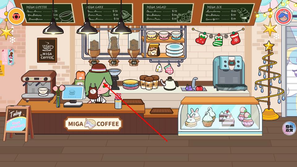 2、进入标有MIGA COFFEE标识的咖啡店场景后,玩家将操控绿发店员角色,在吧台通过操作咖啡机来制作咖啡;与此同时,还能布置圣诞袜、螺旋圣诞树等各类装饰,从而沉浸式地体验店铺的经营流程。