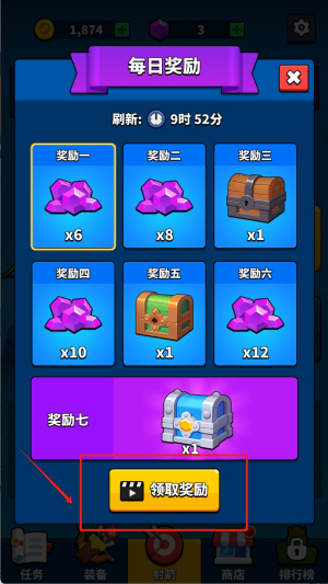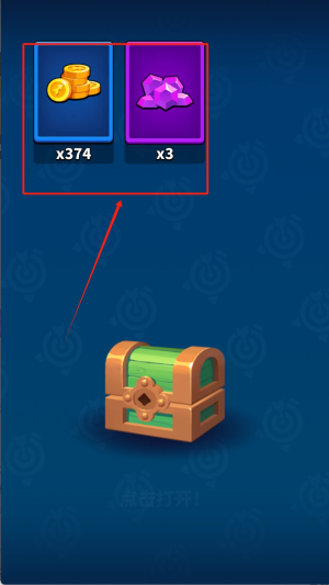 2、点击红框里的金币与道具奖励区域,消耗374金币和3个紫色道具来开启下方的宝箱,从而获取稀有装备以强化弓箭的属性。