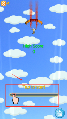 1、游戏启动界面以蓝天白云为背景,画面中设有一个跳伞小人元素。界面左上角清晰显示当前金币数为0、历史最高分也为0,玩家点击下方红框标注的“Tap to start”按钮,即可开启游戏。