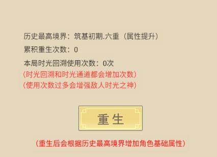 14、不少玩家可能会在这一阶段遭遇失败,不必担心,选择时光回溯或时光隧道功能即可,这两个功能都能无限次使用。之后我们借助回溯的时间继续挑战秘境,提升自身境界。当时间推进到道历6年时,之前出现过的那只异兽会再次来袭,若抵御失败就继续回溯时间;等境界提升到金丹期后,可以考虑进行一次重生(重生会依据历史最高境界增加属性,所以重生是迟早的事);要是愿意多投入些时间,也可以等到元婴期再重生,两者效果相差不大。