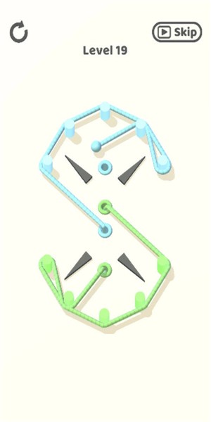 一款以彩色绳线为核心的趣味游戏,只需几条色彩各异的细绳,就能构建出花样繁多的关卡。游戏画面简约雅致,物理机制还原度极高,只需指尖操作即可开启挑战。关卡场景中分布着若干小桩点,玩家需将对应绳线依次穿过每个桩点并固定,过程中需避开黑色障碍物,待所有绳线均正确连接即可完成关卡。