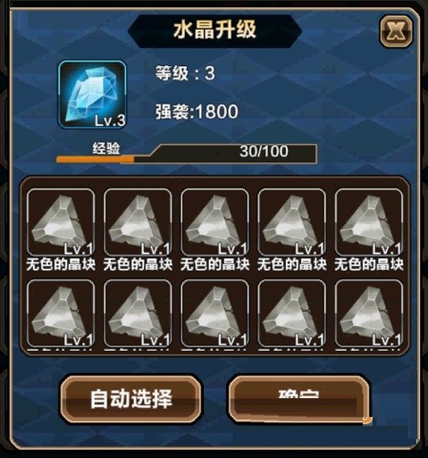 要是觉得逐个操作太繁琐,还能通过自动选择功能,一键选中背包里所有同等级的水晶来升级,升级后的水晶会更厉害哦!