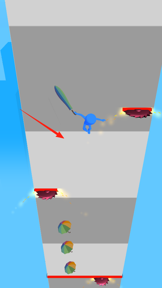 1控制蓝色角色,利用伞状工具在赛道上弹跳,躲开转动的锯片,拾取路上的伞,持续前进,感受避开障碍的玩法。