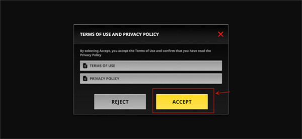①等游戏加载完毕进入游戏界面后,会弹出一个窗口,里面显示的是一些“游戏协议”,直接点击【ACCEPT】按钮确认即可。