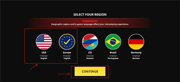 ④会弹出五个地区供选择,因为游戏目前还没有国服,所以我们通常选择【美服】或者【欧服】,也就是列表里的第一个和第二个选项,这两个地区使用的语言都是“英文”