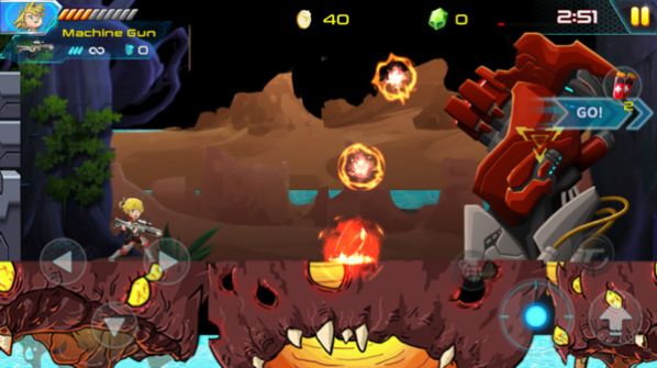 2、在动漫风格的魂斗罗中与各类敌人及boss展开战斗,还能体验到横版卷轴平台游戏带来的精彩乐趣。