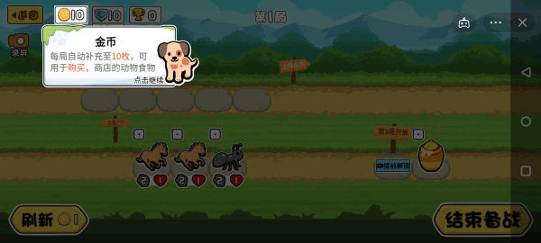 1、首先在动物之战自走棋游戏里,每局都会自动补充10枚金币,这些金币可用于购买商店里的动物食物。