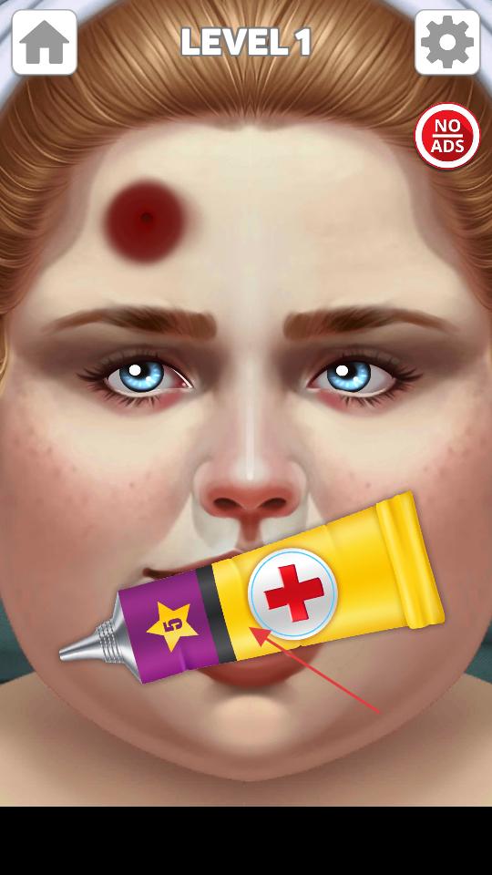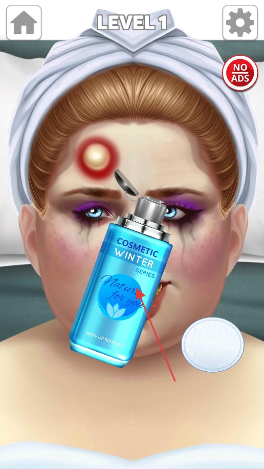 2进入关卡后,角色额头处有凸起的部分。此时需要找到蓝色的卸妆水瓶,点击将其瓶盖打开,接着把卸妆水倒在白色化妆棉上,再用蘸有卸妆水的化妆棉轻轻敷在额头,完成清洁操作。
