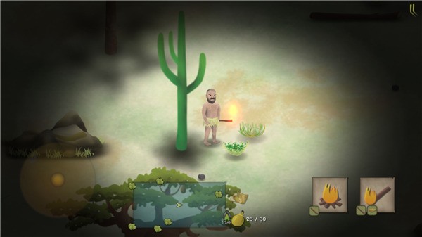 2、高度开放的设定让你能在地图任意位置安营扎寨、采集原料,也可以扔石头打猎,除了石头还能制作叉子和弓箭。