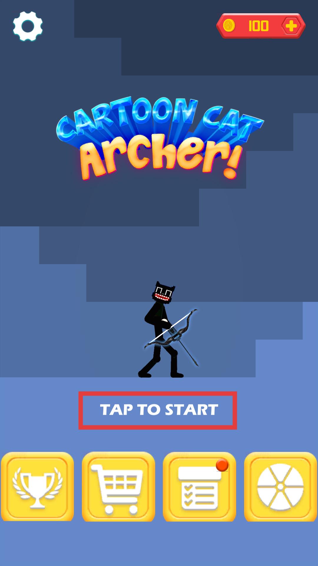 1点击“开始游戏”按钮进入游戏,你将操控一名卡通猫形象的弓箭手。游戏初始阶段,可查看界面下方的功能按钮,熟悉奖杯系统、商店等功能模块,为后续的战斗环节做好准备。