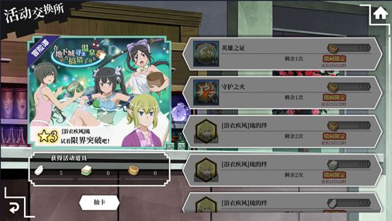 5、活动道具 活动道具根据作用,分为以下2种 兑换道具:用来兑换活动交换所的东西 抽奖道具:用来在活动抽卡中,抽取活动奖励,主要是用来抽3星券的,因为通常活动3星券是可以抽到相关主题角色的 每次抽到3星券可以重置卡池,继续抽3星券,但是好像有上限,直到没有3星券为止