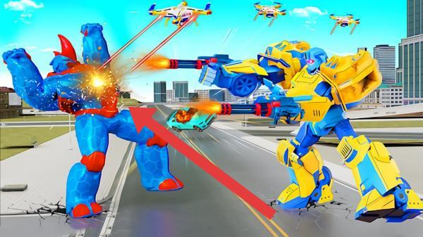 2、机甲角色、无人机、城市道路场景与战斗特效相互配合,生动展现出机甲对战的激烈场面,契合“变形机器人格斗”“机甲战争”这类风格,属于动作格斗玩法里机甲对抗的典型场景。