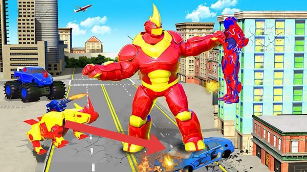 3、机甲角色(红黄色大型机甲、红蓝配色机甲、黄红机械恐龙)、怪兽车、城市道路场景(包含建筑、破损路面、汽车爆炸特效)、飞机等元素,共同呈现机甲破坏城市的战斗场面。