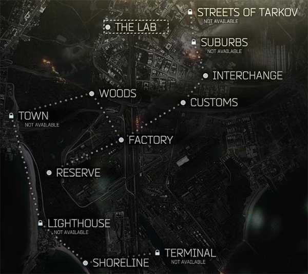 目前游戏里已开放的地图有:工厂、储备站、实验室(要用到白卡钥匙才能进入)、森林、立交桥、海岸线和海关。除了实验室只有一种时间设定,其他地图都有昼夜两种模式。而工厂是唯一一个固定在白天的地图,很适合新手用来熟悉基础节奏。