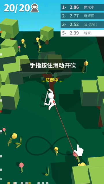2、按照提示【手指按住滑动开砍】的操作指引,通过滑动屏幕来控制角色挥刀发起攻击;当手指不滑动屏幕时,角色便处于防御状态。