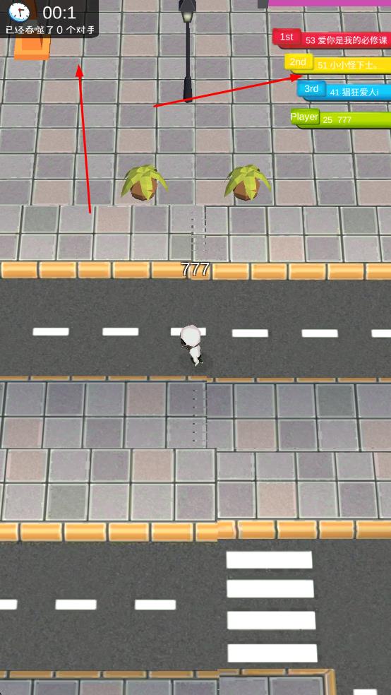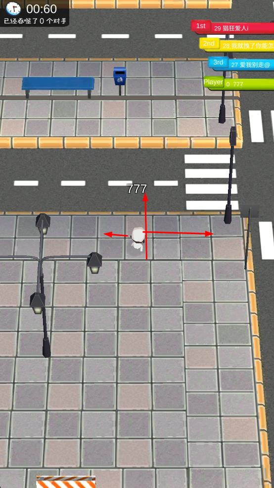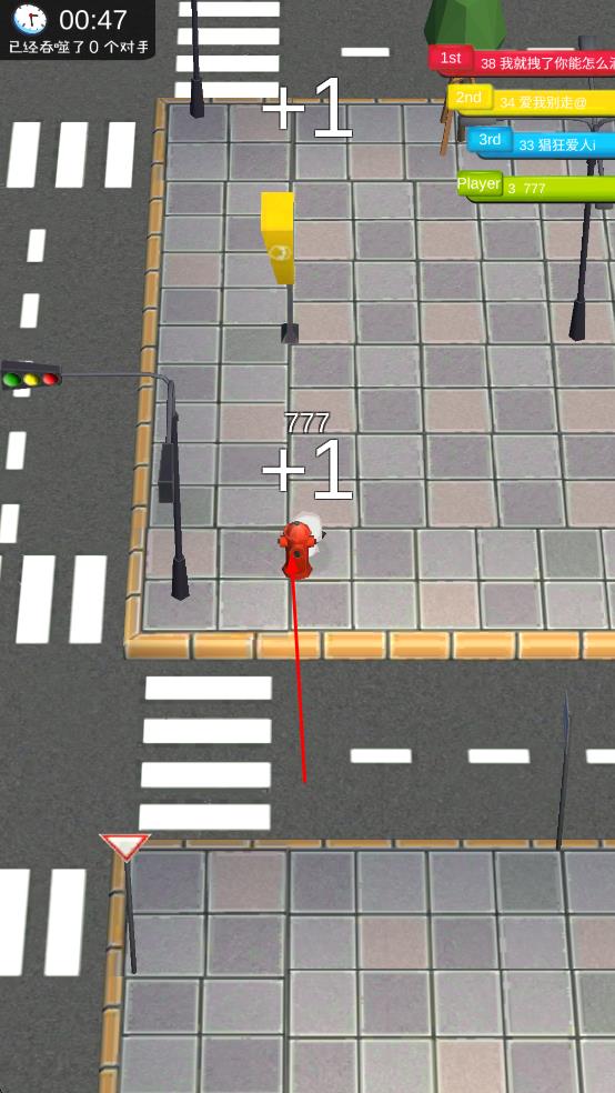 1进入游戏后,操控白色角色在城市街道中移动,通过吞噬路灯、消防栓之类的物体,来提升自身的标识数字。