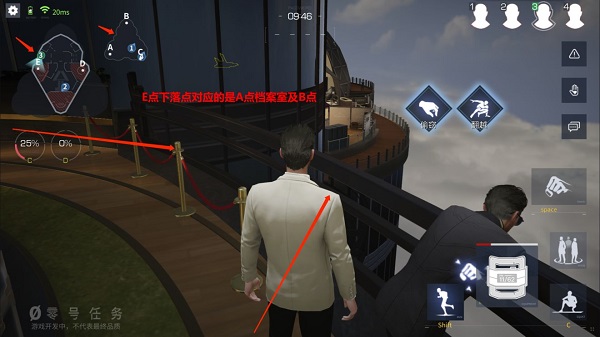 1楼A点看向二楼E点窗户走廊,明显有2个下落点,分别对应着E点1号下落点的楼梯管理处和E点2号下落点的厨房管理处。同时注意左侧小地图划线处(这里经常是潜入方和追击方的纠缠点),队友倒地可通过这些落地点进行救援。