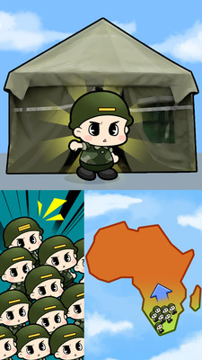 建造从兵营到士官学校的一系列建筑,培养从士兵到军官的一众猛将,建立武器工厂生产坦克、战斗机和战舰,以此打造最强军队。你的点击能提升士兵的训练效率。