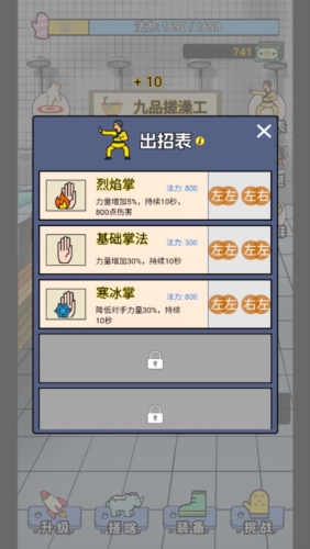 1. 在尔滨搓澡之王游戏里,不仅能解锁独特的搓澡掌法,游戏界面中还会显示出招表。
