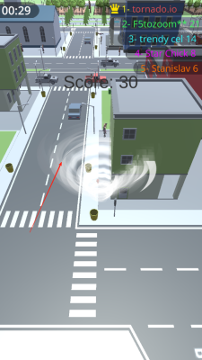 1、操控小龙卷风在街道场景里启动移动,碰到路边的垃圾桶、小石块这类物体,靠近它们让其被卷入,龙卷风的体积会渐渐增大。