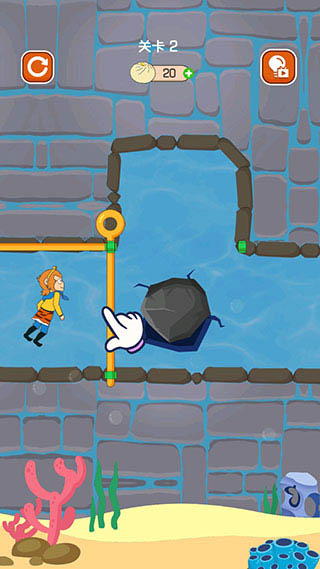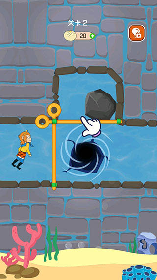 3、第二关要先将横向的拉杆拉开,使石块掉落堵住洞口。