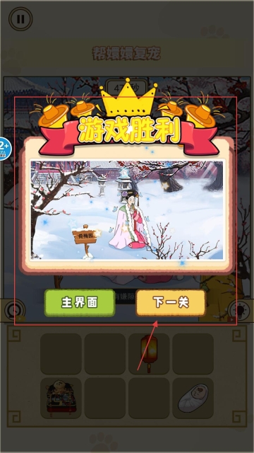 4、在顺利完成对嬛嬛的装扮以及场景布置后,界面会显示【游戏胜利】,此时玩家可以选择点击【主界面】返回,或者点击【下一关】继续进行挑战。