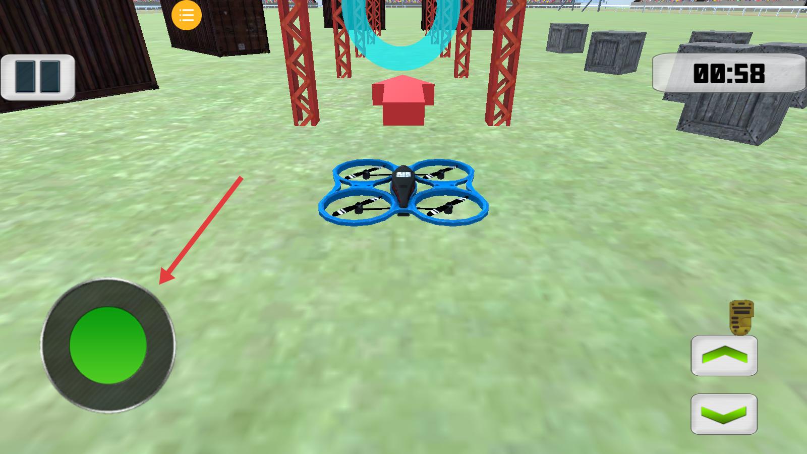 3、进入关卡后,能看到无人机处于设有障碍物和蓝色圆环的场地里,界面左下角有个绿色按钮,点击它就能操控无人机移动,试着让无人机穿过蓝色圆环这类障碍物。