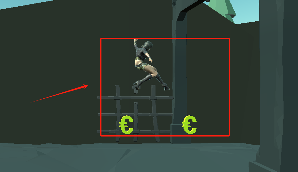 3画面中角色正进行跳跃动作,其下方的黄色欧元标识代表着金币奖励区域,而红色箭头则在提示:点击栅栏所在的方向,就能触发特殊技能。