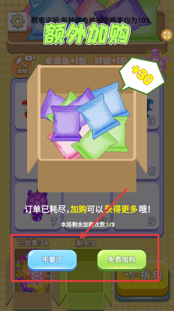 4、订单使用完毕后,可选择【免费加购】来获取更多礼包,也可以点击【不要了】结束操作。