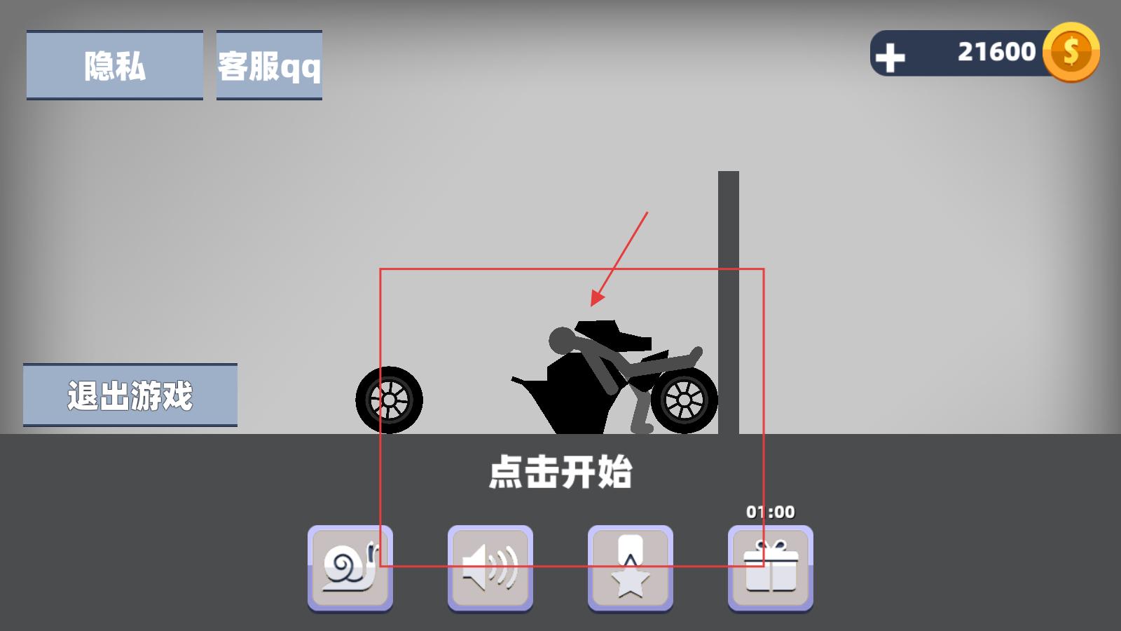 1打开游戏后,找到启动按钮并点击,即可操控火柴人角色驾驶摩托;通过操作界面上的控制按键来调整行驶状态,过程中注意躲避各类障碍物,努力完成关卡挑战。