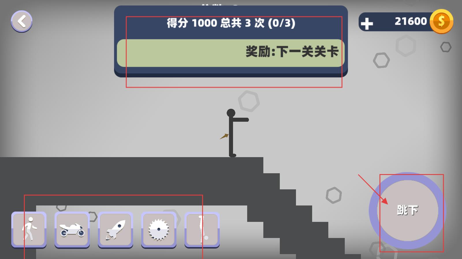 2玩家在关卡内可根据需求挑选左侧栏的道具,当碰到台阶这类地形时,点击对应的跳跃按钮就能完成向下的跳跃动作,同时积累相应的分数。