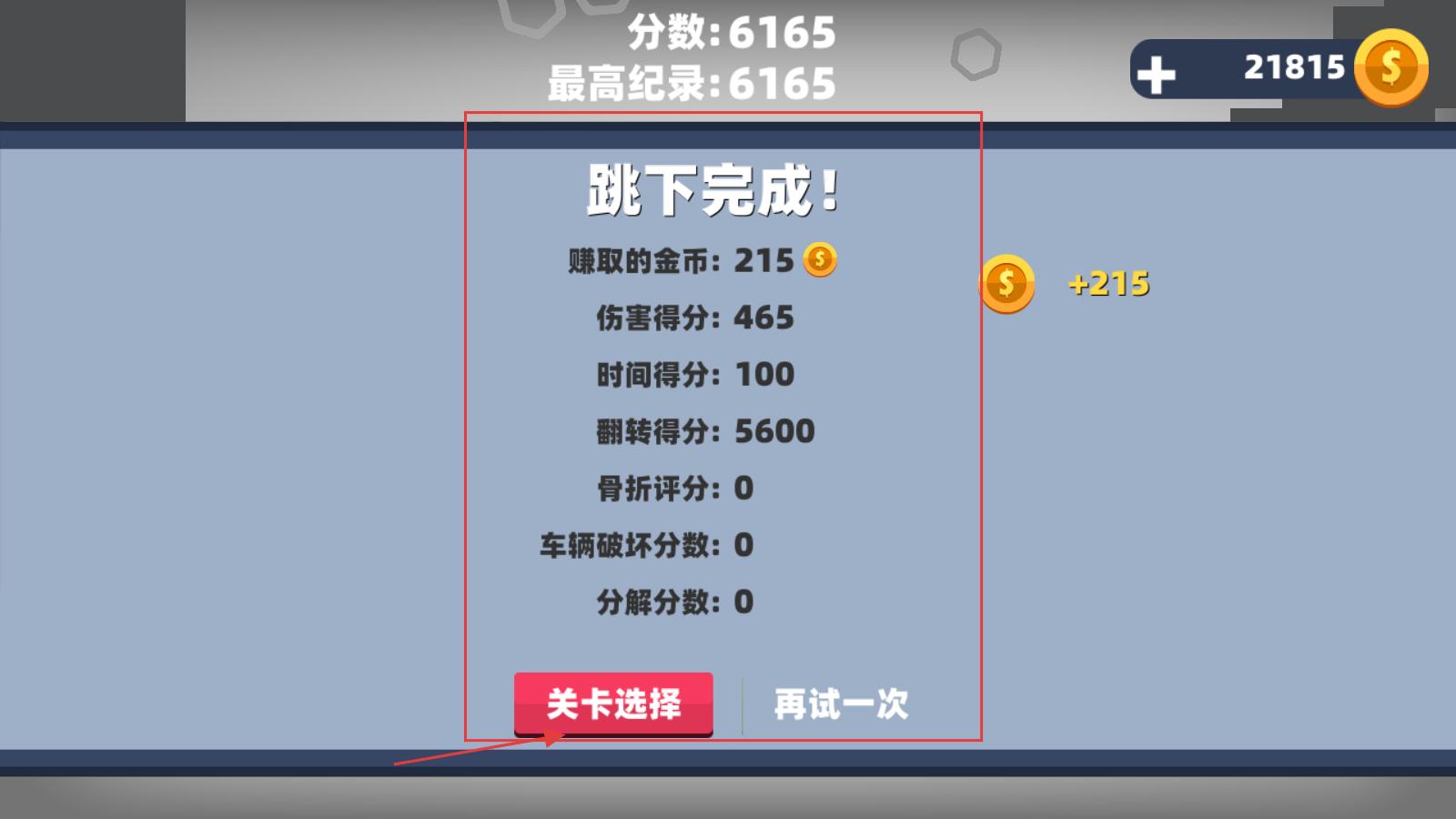 3、完成跳跃后,查看得分与奖励,点击关卡选择解锁新关卡,或重新挑战刷新纪录,积累金币进行升级。