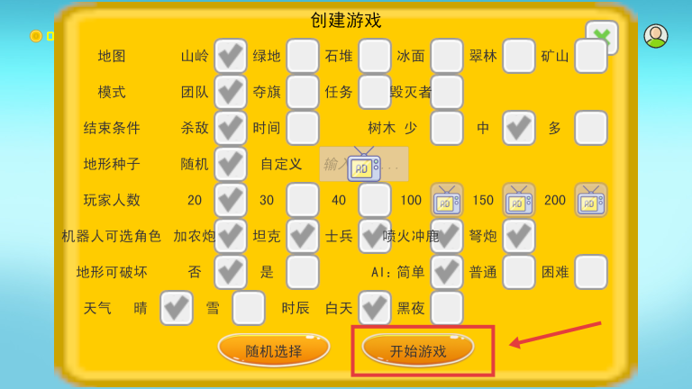 2在创建游戏界面,选择“山岭”地图和“团队”模式,确认各项参数无误后,点击“开始游戏”按钮,即可进入战斗环节。