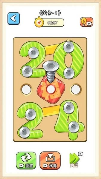 在一款以拧螺丝和打螺丝为核心玩法的手机游戏里,玩家需要处理各种关卡中的绳结问题。不同颜色的绳结需要按规则连接摆放,确保线条不交叉,同时把每颗螺丝都精准固定到对应位置,才能顺利通过关卡。
