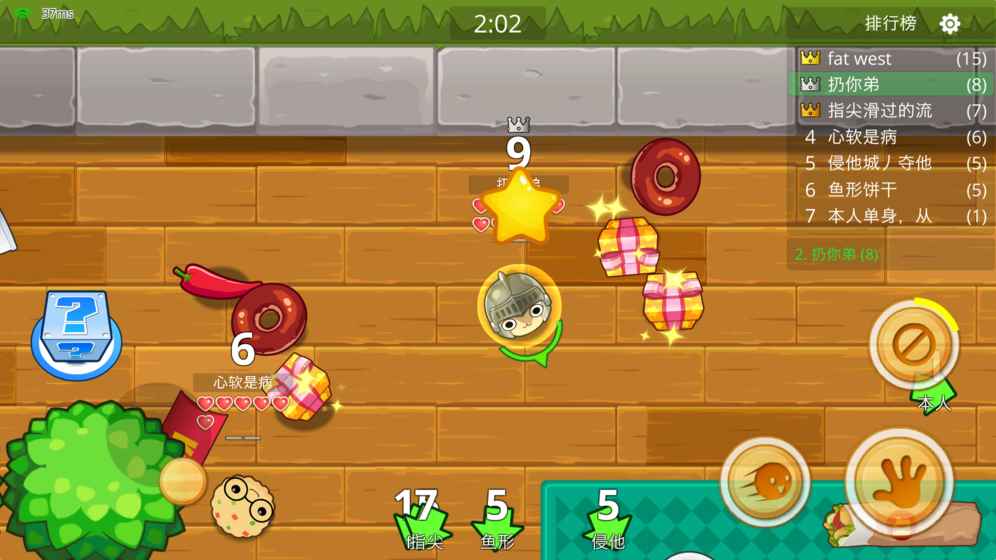 1在对战场景里,你可以把周围散落的各类物品——像带着芝士香气的圆盘状食物、夹着肉饼的面包、橙红色的长条蔬菜等——都当作攻击工具。抓起它们朝对方砸过去,击倒敌人后就能收集他们掉落的闪亮星屑。要是进入了能量爆发的状态,连那些挡路的障碍物都能直接举起,用这些大家伙狠狠教训挡在面前的对手。