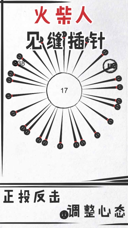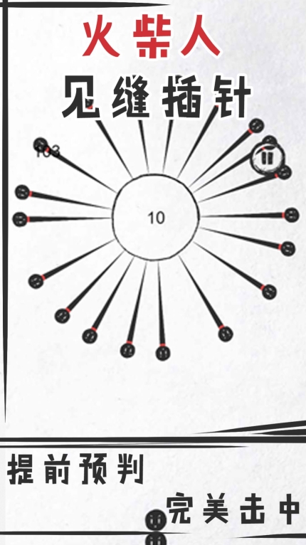 轻点屏幕,把下方火柴人的针头发射至旋转的轮盘上,直至下方所有火柴人都发射完毕,且在这个过程中,针头没有碰到任何一个小球,如此便算成功通关。