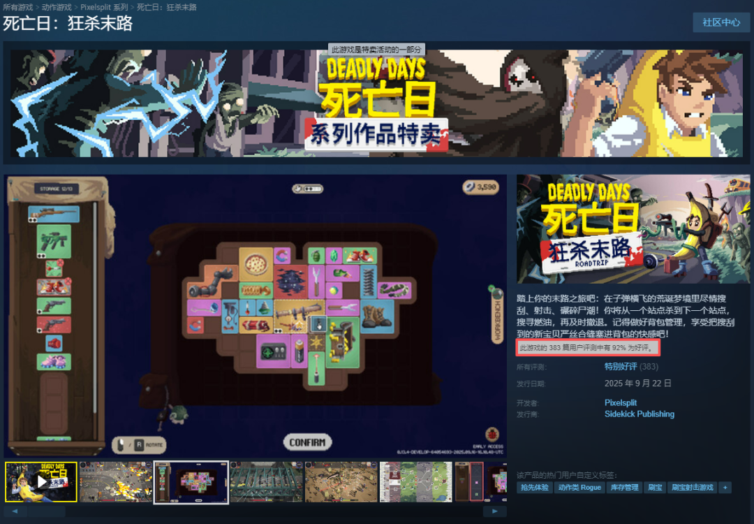 前段时间,又一款为“幸存者”玩法注入新意的游戏《死亡日:狂杀末路》(Deadly Days: Roadtrip)在Steam正式上线。