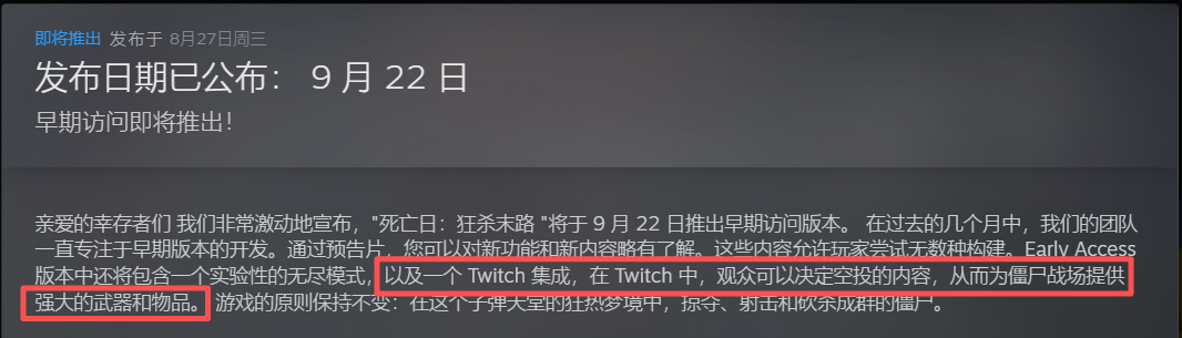 而开发商Pixelsplit也表示在未来的几周内,将持续推出大量的补丁和修复以及未来更新内容的预告。此外,发行商INSTINCT3与开发商Pixelsplit还为《死亡日:狂杀末路》打造了专属的Twitch直播插件,用来增强主播与观众之间的互动体验。