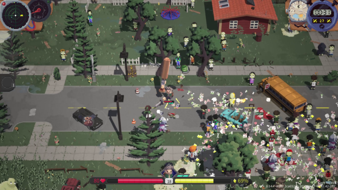 通过像素艺术的复古韵味,勾勒出一个危机四伏却又充满黑色幽默的丧尸世界。游戏中的场景破坏效果、物理碰撞反馈都体现出令人惊喜的细节打磨,尤其是在尸潮汹涌时,经常能看到被撞飞的场景道具。