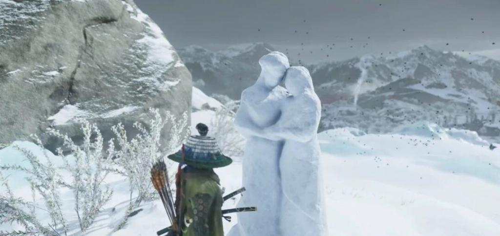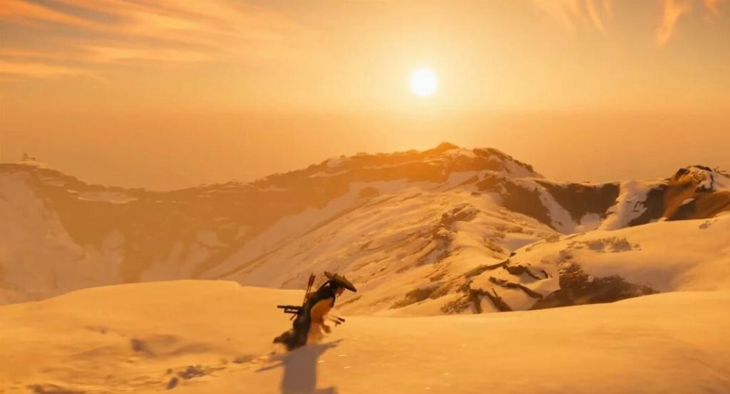 对比之下,《羊蹄山之魂》实际上都没能真正复现标题中的 " 羊蹄山 "。从远处看去巍峨壮阔的雪山,真正可探索的内容是将玩家从山脚传送到半山腰后,经由一通 " 跳跳乐 " 便来到山顶,多少还是会让人感到一些预期落差,以及察觉技术与成本层面的妥协。