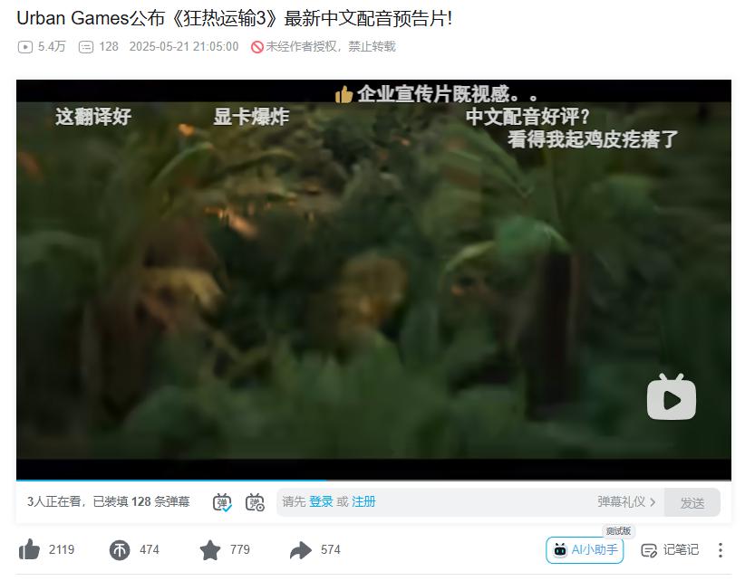 5 月份的时候,《狂热运输 3》在 B 站官号发布了首支预告片,还是中文配音的,得到了积极的反馈。
