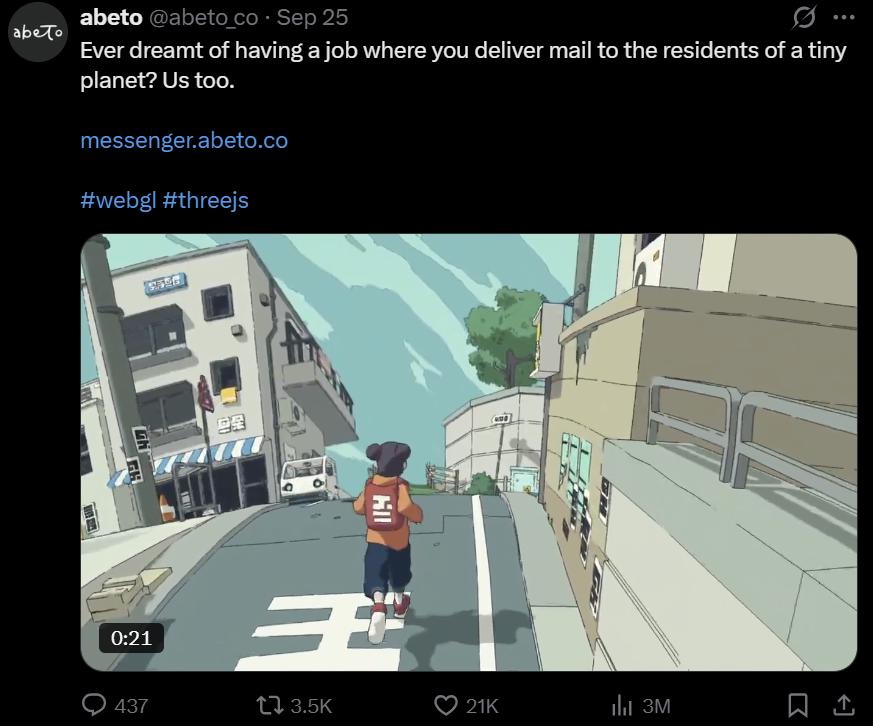 这家工作室名叫 Abeto,前几天他们发布了一条推文,附带一条游戏视频,文中只简单地写了一句话:" 你有没有梦想过拥有一份,可以给一个小星球上居民送邮件的工作?我们也有。"