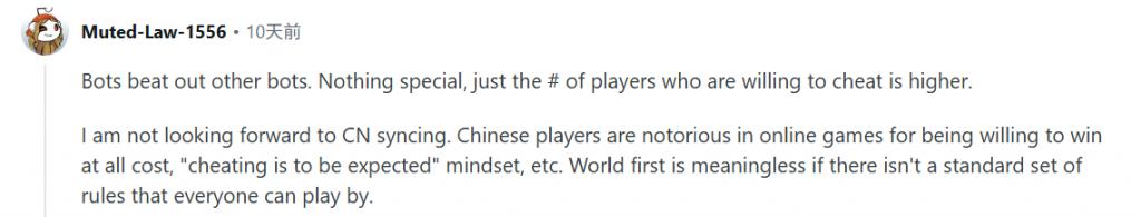 更严重一些的,甚至暗示国服拿到第一靠的只是服务器里有更多的机器人,说中国玩家为了 " 赢 " 向来不择手段。