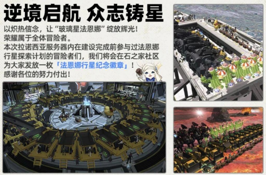 为了纪念拉诺西亚服务器达成全球首通,FF14 国区官方也在当天送上了祝贺,并提到将在国服的社区 APP 石之家里,向本次在拉诺西亚服务器内,在建设完成前参与过法恩娜行星探索计划的玩家们,发放特别的 " 法恩娜行星纪念徽章 "。