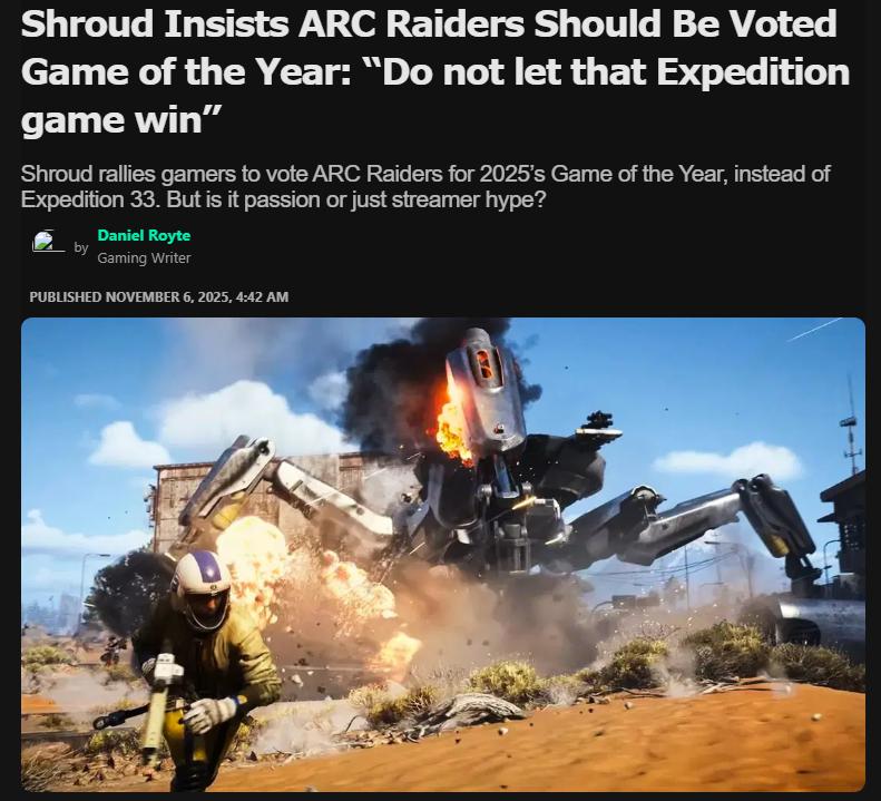 (国外知名主播 Shroud 认为年度游戏应该给《ARC Raiders》而不是《光与影:33 号远征队》)