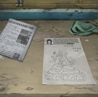 18.回到一楼,将画纸摆放在一楼走廊处的供桌上,插上香,触发剧情
