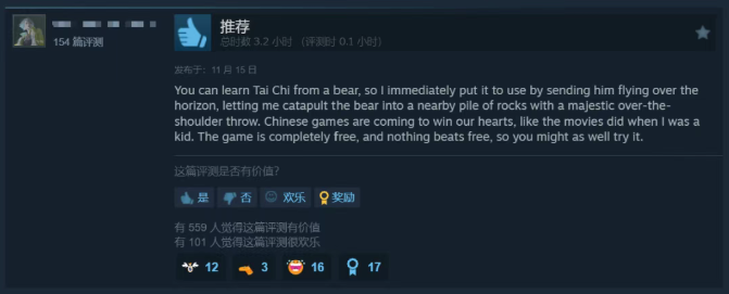 不少海外玩家也对《燕云》中的轻功、点穴、太极文化情有独钟:“从一头熊那里学会太极拳后,我立刻学以致用——把它扔飞过地平线。”