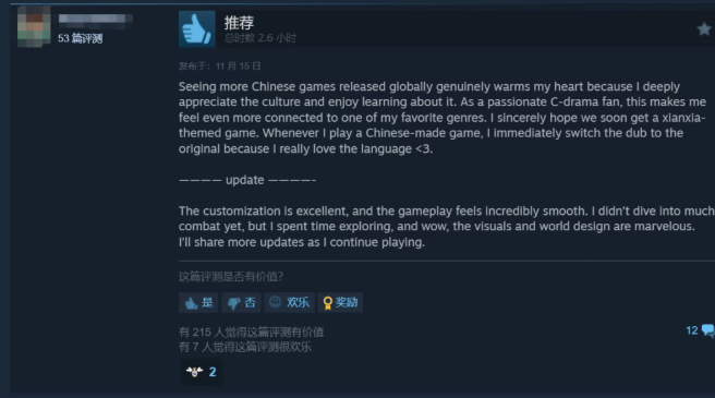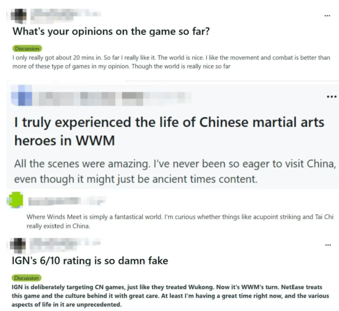 从游戏商城的评论区到Reddit、Kotaku等海外游戏论坛,我们能够发现,海外玩家们相当热衷于分享有关《燕云》游戏体验的心得,还对游戏中蕴含的中国武侠文化展现出浓厚的好奇心与探索欲望,甚至延伸成为对整个中国传统文化的向往与认同。